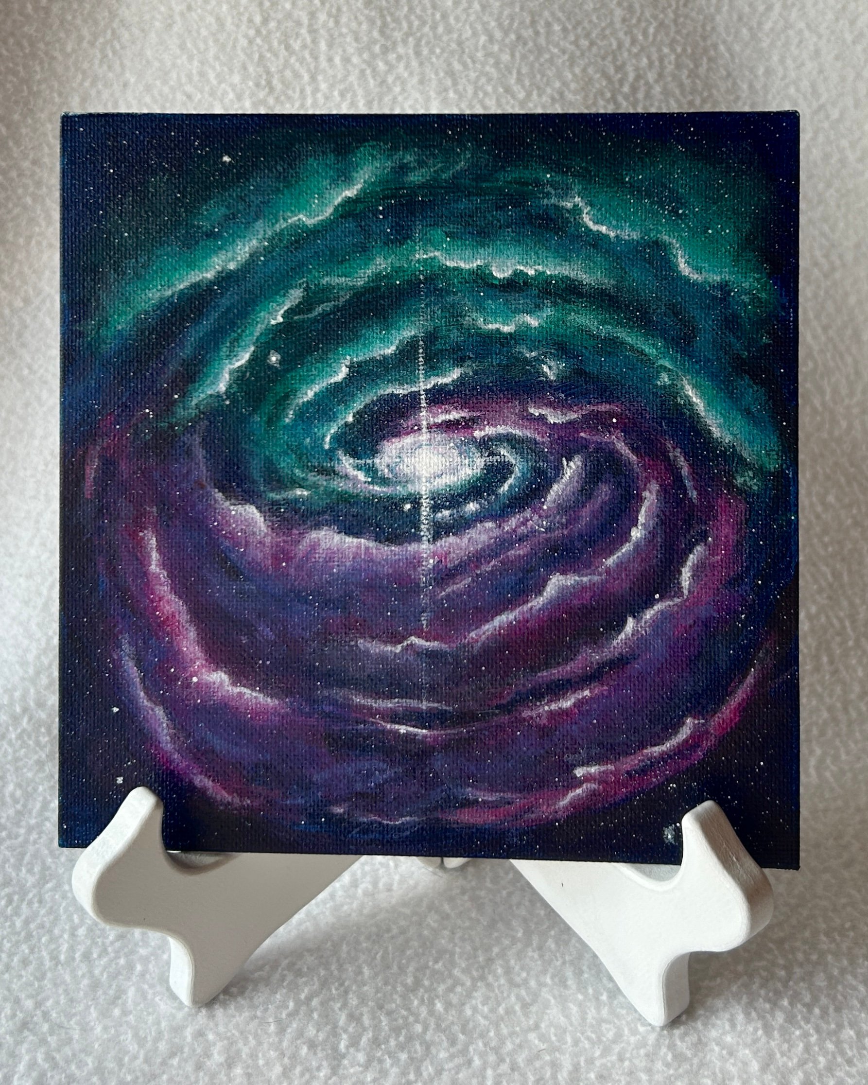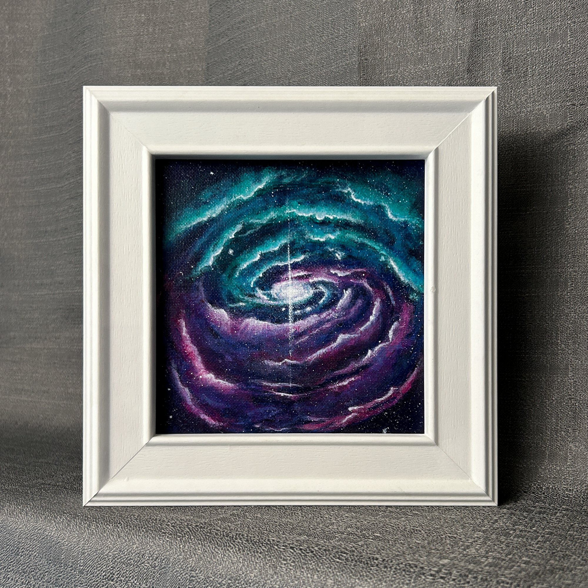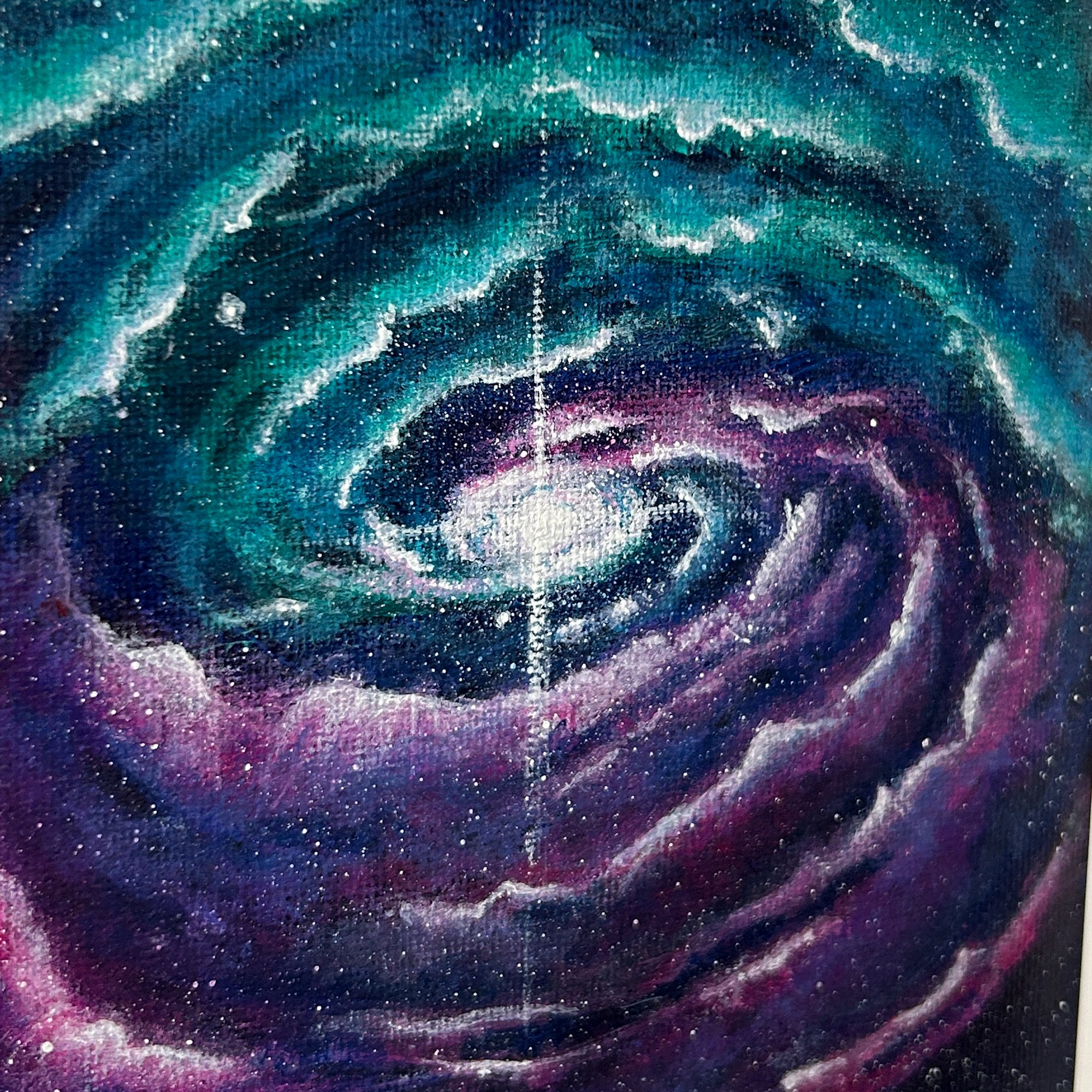 This painting is the only one in the series that depicts a galaxy instead of a nebula. The gaseous clouds swirl around a bright pulsar, drawing you closer to the center, almost like a meditation labyrinth. Comes with a handmade thank-you card and a certificate of authenticity.