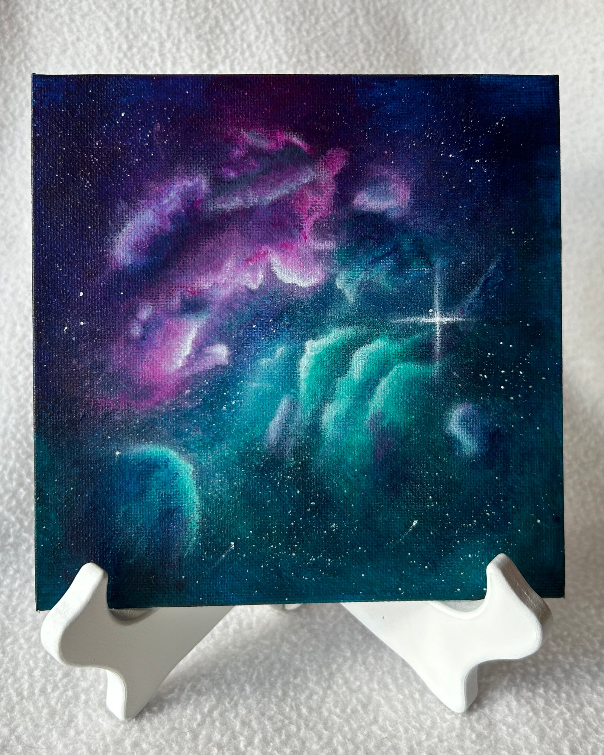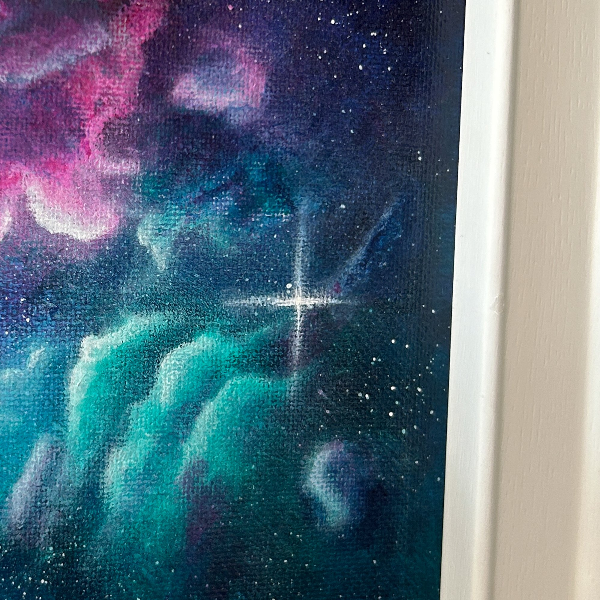 My goal for this painting was so capture the soft glow I developed in Stargazing 6 and combine it with the crisp edges of Stargazing 5. I also wanted to revisit the diagonal composition from Stargazing 3. I pushed the contrast between the bright center and surrounding dark space as far as I dared, resulting in a lovely vignette. Comes with a handmade thank-you card and a certificate of authenticity.