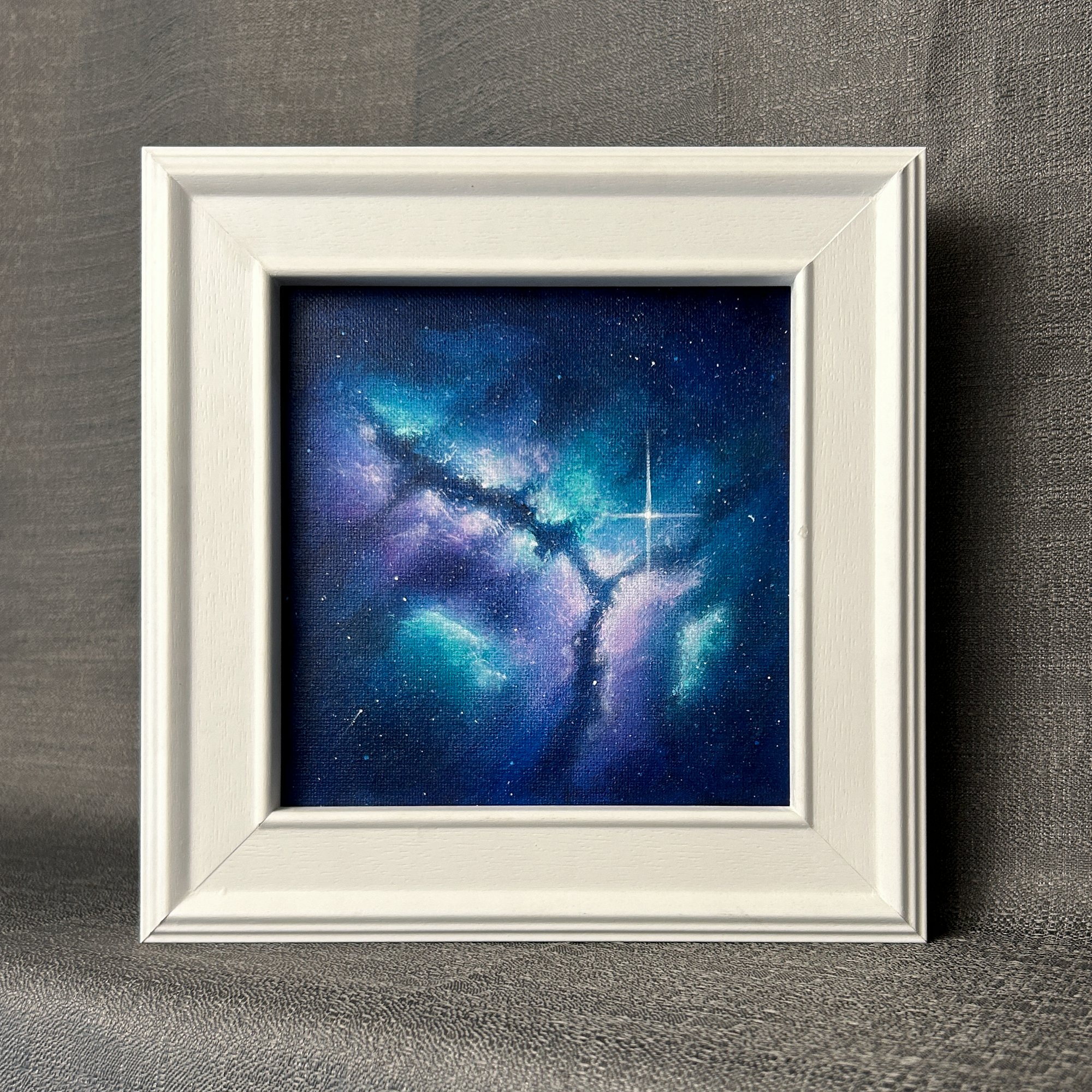 This painting is the culmination of everything I've learned over the course of creating this outer space series. I employed all the techniques I had developed along the way: a value underpainting, thin layers of color with glazing medium, dry-brushed white paint for glowing areas. I also incorporated a new tool: the everyday kitchen sponge. Using the rough side to apply thin layers of paint created these fine tendrils in the clouds, too fine to create with a brush. Alternating between the sponge and a brush allowed me to achieve a balance between crisp details and soft glowing edges, which is what I had been striving for during the entire series. Comes with a handmade thank-you card and a certificate of authenticity.