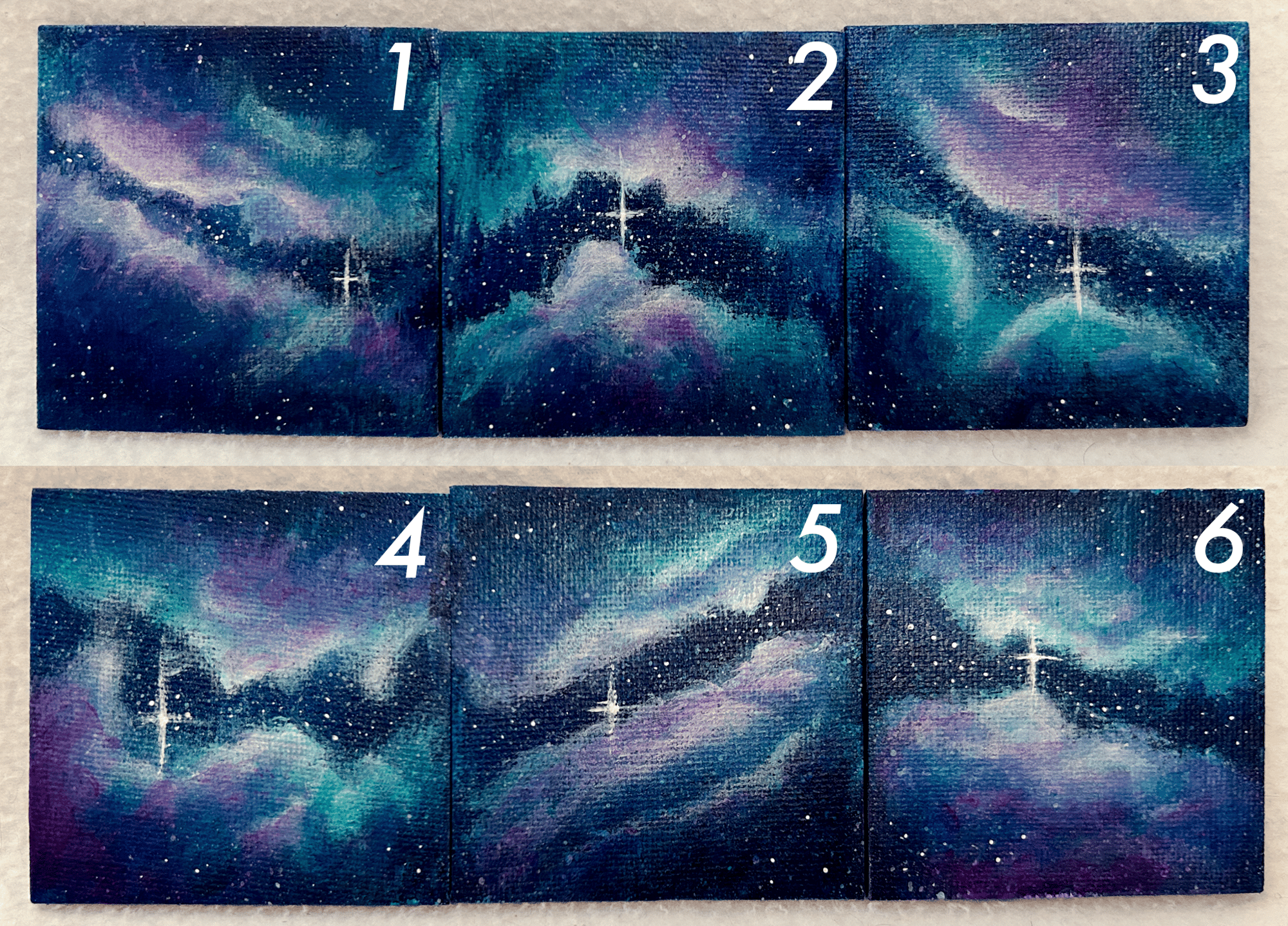 Minature nebula painting with magnetic backing, perfect for those who love to collect fridge magnets as well as original art.